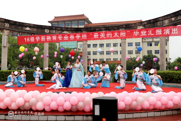 上午8:30,以“最美的太阳”为主题的毕业汇报演出正式开始。2016级学前教育专业的同学们载歌载舞,用青春的自信感染着在场的每一个观众,把他们多才多艺的一面展现得淋漓尽致。演出节目形式多样,同学们惟妙惟肖的表演技能,引得台下观众掌声如潮。那娴熟流畅的舞蹈动作,让观众见识了同学们扎实的舞蹈功底。最后,毕业生们用歌声表达了对未来生活的美好向往。