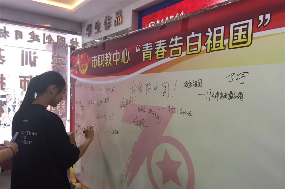 9月16日下午,市职教中心团委在教学楼大厅举行“青春告白祖国”寄语签名活动。刚刚下课的学生纷纷前来签名,向祖国深情表白。“我爱祖国”“我爱你!中国”“厉害了,我的国”等字句流露出职教学子对祖国深沉的爱,表现了诚挚的爱国情感。