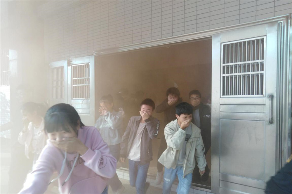 下午15点36分,校长、演习总指挥胡浩然发出命令后演习开始。随着烟雾弹燃放,警报响起,演练正式开始。按照提前制定的消防暨防震减灾疏散演练方案,各班班主任和任课老师迅速组织本班学生撤离,各班学生在老师的指挥下弯着腰、猫着步、捂住口鼻,沿着指定逃生路线,安全、有序、迅速撤离到学校操场的安全地带。短短7分钟,4000余名师生全部快速、有序、安全到达指定地点。