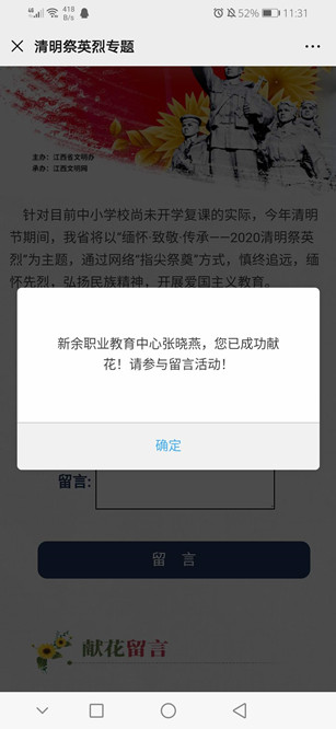 团员们登录江西文明网微信平台进行网上祭奠,发表祭奠感言,向先贤先烈鞠躬致敬、敬献鲜花、抒写感言、签名寄语。团员们还在团员微信群内学习了吹哨人李文亮、医院院长刘智明、十九夜鏖战医生宋英杰等抗疫英雄事迹。此次活动旨在引导广大团员向伟大的革命烈士和英勇的战“疫”英雄们致敬,传承红色革命精神,树立精忠报国之志,告慰永垂不朽的中华英魂。