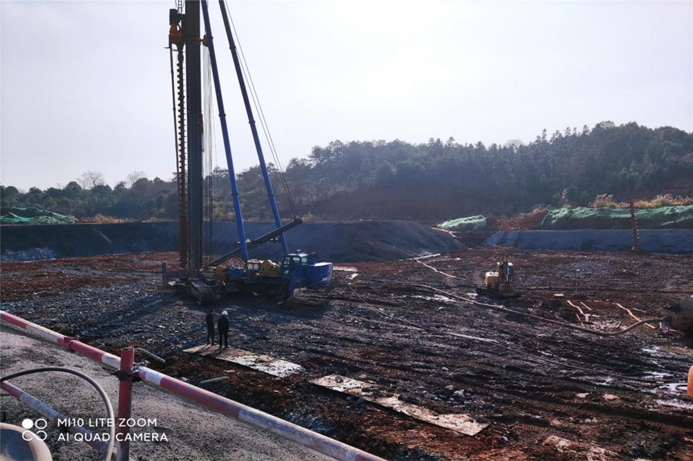 1号综合楼人防(停车场)基坑人防支护施工结束,螺旋桩施工中
