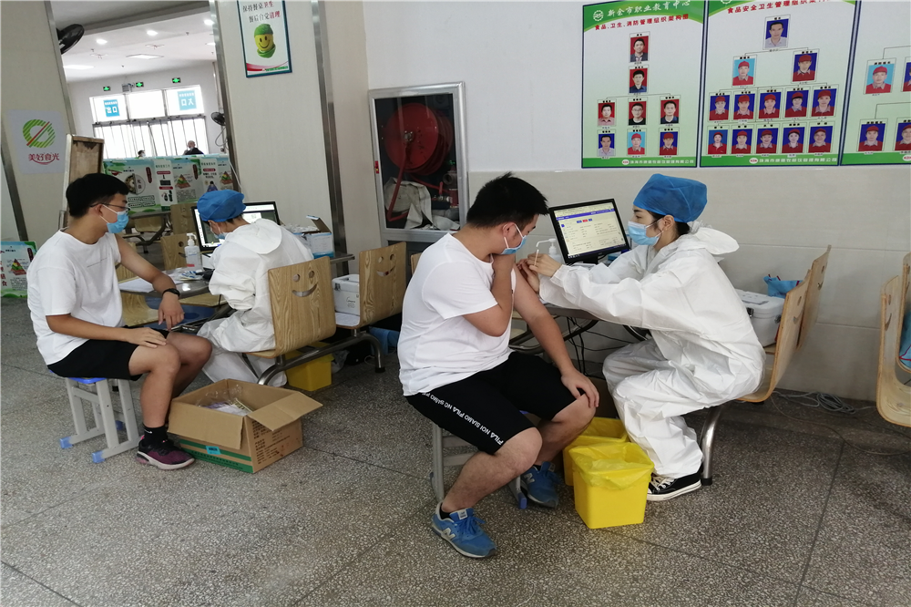 根据新余市疾病预防控制中心2021年7月23日下发通知精神,8月份,我市启动并完成15-17岁人群第一剂新冠疫苗接种,市职教中心精心组织,于7月31下向全校15-17岁在校生下发了《新余市职业教育中心(15-17岁学生)疫苗接种安排》,要求学生8月3日前完成就地就近接种或8月4日上午来校集中接种。8月4日上午,由新余市人民医院第二门诊医生及护士8人,在我校食堂一楼布置的临时接种点,为我校进行集中疫苗接种。