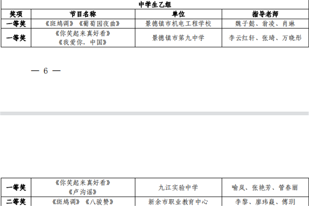 为庆祝建党 100 周年,根据《关于举办江西省教育系统庆祝建党 100 周年师生合唱展示活动的通知》精神,我校高度重视、精心组织,在校园内营造了共唱红歌学党史的浓厚氛围。其中,我校教师李黎、廖玮嶷、傅玥三位老师编排的《斑鸠调》《八骏赞》节目荣获中学生乙组二等奖。