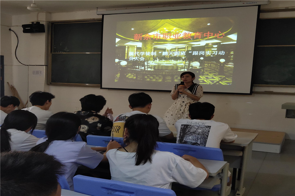 根据酒店管理专业“现代学徒制”人才培养方案安排,2020级春酒店管理1班即将进入跟岗实习阶段。9月5号下午,市职教中心召开了现代学徒制“鹏天阁班”跟岗实习学生动员会和学生家长会议。会议在教学楼B楼201教室举行,分管校领导邹建峰、实训实习中心主任帅国勇、班主任郭毓之以及2020级酒店管理班学生和学生家长参加了动员会。