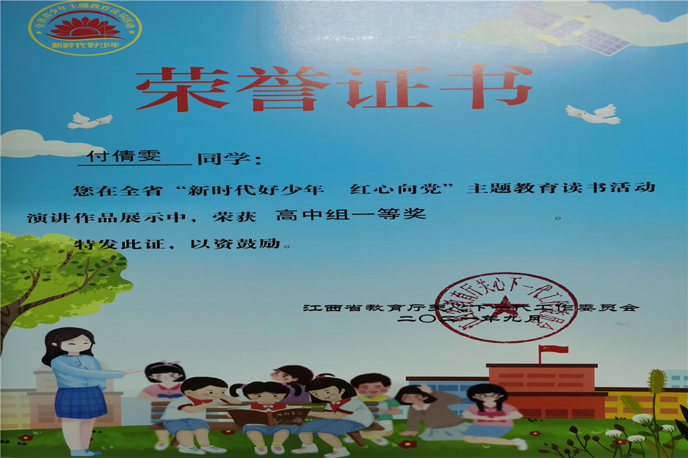 近日,从江西省教育厅关心下一代工作委员会下发的《关于表扬“新时代好少年·红心向党”主题教育读书活动先进的通报》(赣教关函〔2021〕15号)文件获悉我校关工委荣获“江西省‘新时代好少年’主题教育读书活动‘红心向党’先进集体”荣誉称号,报送的主题演讲作品获省一等奖1个,二等奖3个,三等奖5个,先进个人1个。