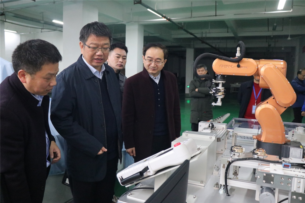 在工业机器人实训室,裴鸿卫副厅长仔细询问了学校工业机器人专业建设、师资、学生实训等情况。胡浩然校长介绍了工业机器人专业开设的背景和人才培养目标,该专业主要采取校企合作模式办学,专业建设方案由校企双方共同商定,专业核心课程请企业工程师到校进行授课。
