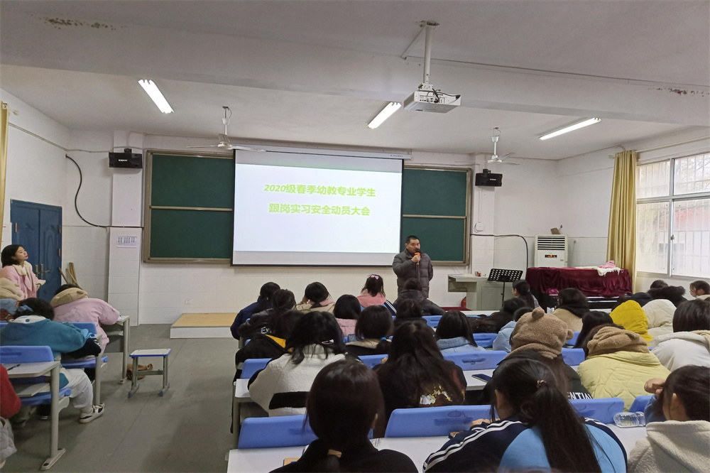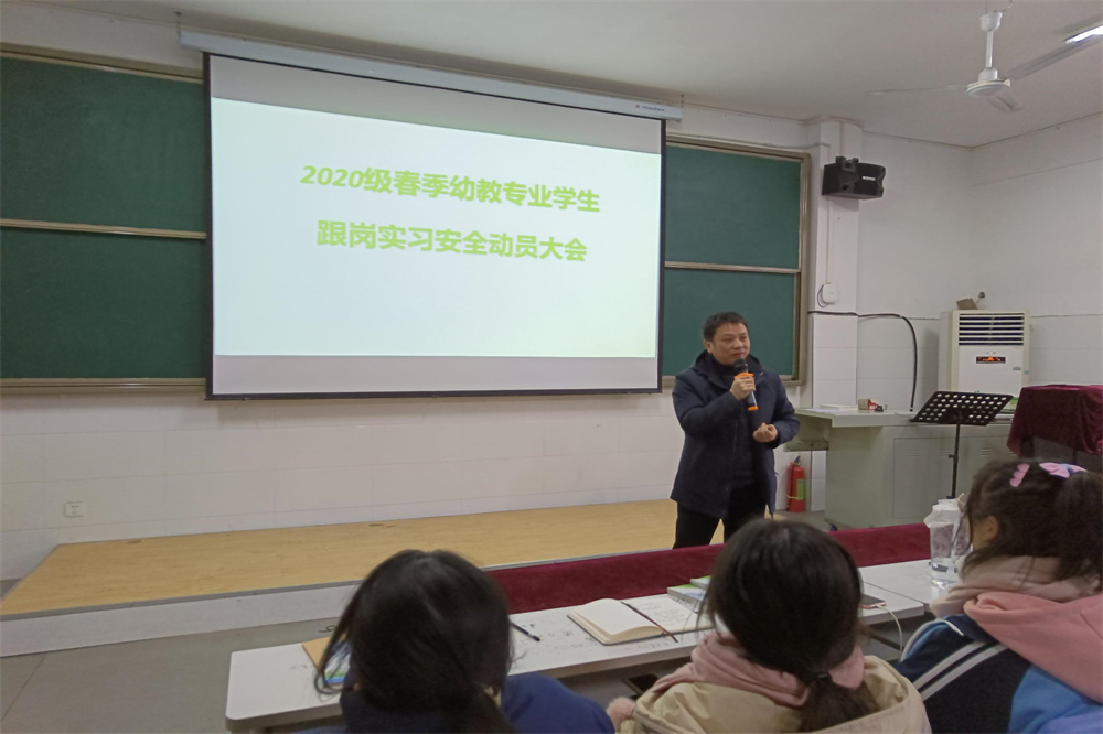 实习前,实习实验中心在2月22日下午14:40组织相关的实习学生,在教学楼B201教室召开了实习学生安全动员会,会上,实训中心主任帅国勇告诫同学们在幼儿园进行实践时,要牢记自己的双重身份,遵守实习单位的规章制度,同时遵守学校的校规校纪;认真履行岗位的职责,发挥专业的特长,实践学到的专业知识,提高综合素养。最后强调了在实习中既注意自己的人身安全也要注意幼儿的人身安全。