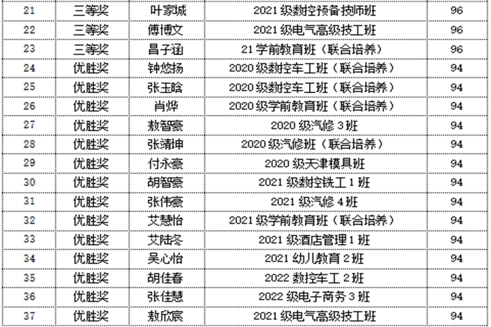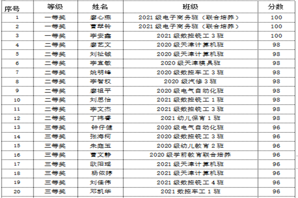 活动分两阶段进行,第一阶段由各思政课教师在各班内部进行了选拔活动,每班选出2位优秀选手参加全校决赛。第二阶段决赛采用闭卷考试的形式于6月15日下午16点30在B201大教室进行。150多名选手参加了决赛,其中2021级电子商务联合培养班的廖心燕、曹翠铃和20201级数控铣工3班的李安鑫三位同学同时以满分的成绩荣获一等奖,2020天津计算机班廖艺文等九位同学均以98分荣获二等奖,2020电气自动化班钟仔健等十一位同学均以96分荣获三等奖,2020车工联合培养班钟悠扬等十四位同学以94分获得优胜奖。