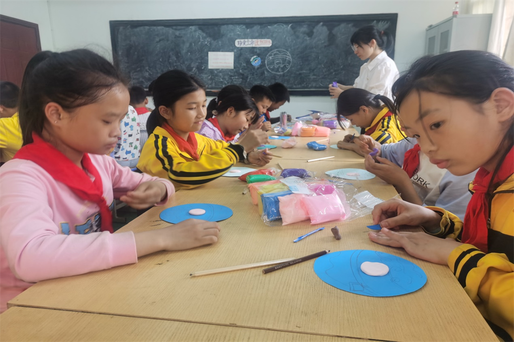 仪式后,与会人员观摩市职教中心的青年党员教师们为湖泽中心学校的学生上美术手工课与音乐课。在课堂上,湖泽镇中心学校同学们在陈欢老师的引导下共同制作自己的“防溺水”粘土画、刘江欣老师教授小朋友们演唱《孤勇者》手势歌。课程结束后,学生们的脸上洋溢着满足的笑容,簇拥着党员教师们展示着自己的课后成果。