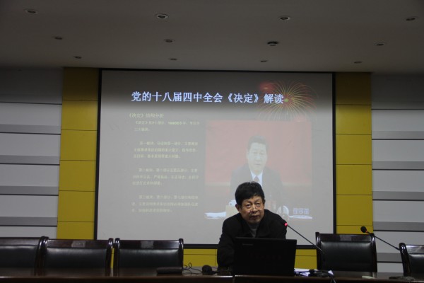 12月12日下午,我校邀请市教育局党委副书记郑如鸥到校作党的十八届四中全会精神专题辅导报告,我校全体教职工在图书馆五楼会议室聆听了报告会,会议由校党委书记胡浩然主持。