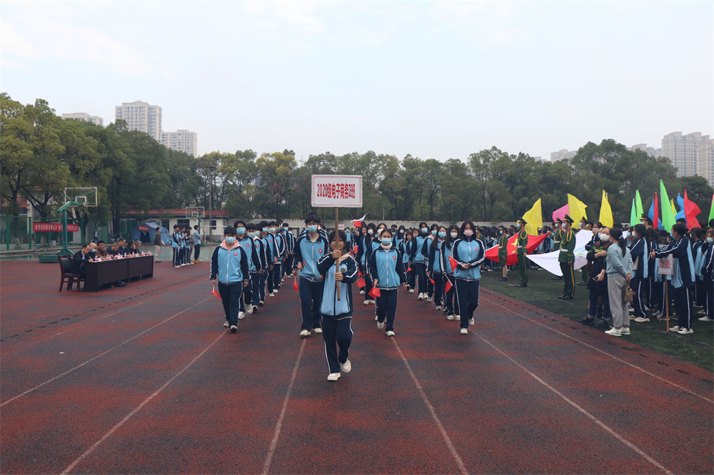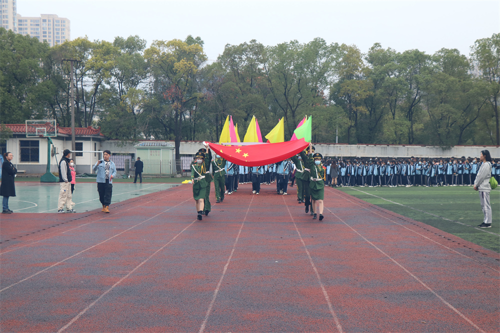 伴着催人奋进的旋律,踩着铿锵有力的节拍,国旗护卫队员拥护着鲜艳的五星红旗健步走入操场,彩旗队、会徽队气势豪迈经过主席台,向场边观众展示青春的风采。