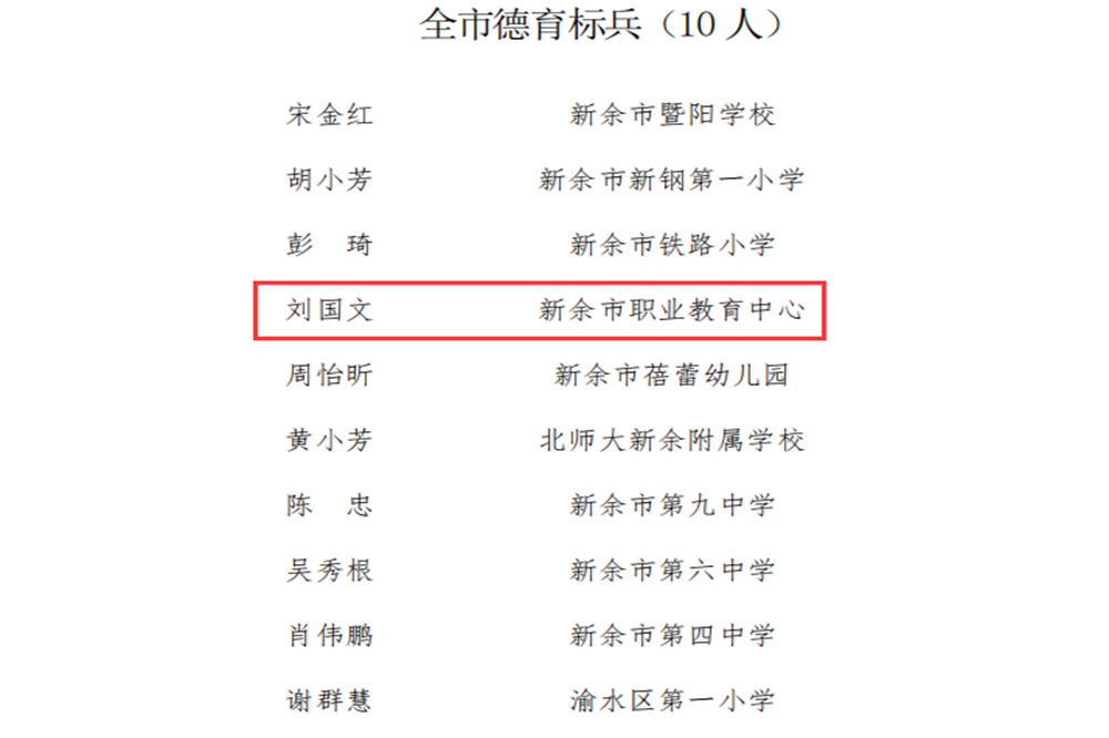 近日,新余市委宣传部、新余市教育局下发《关于命名全市“德育品牌学校”“德育标兵”“德育工作先进个人”的决定》,市职教中心被评为“新余市德育品牌学校”,刘国文荣获“德育标兵”“德育工作先进个人”,林露荣获“德育工作先进个人”。