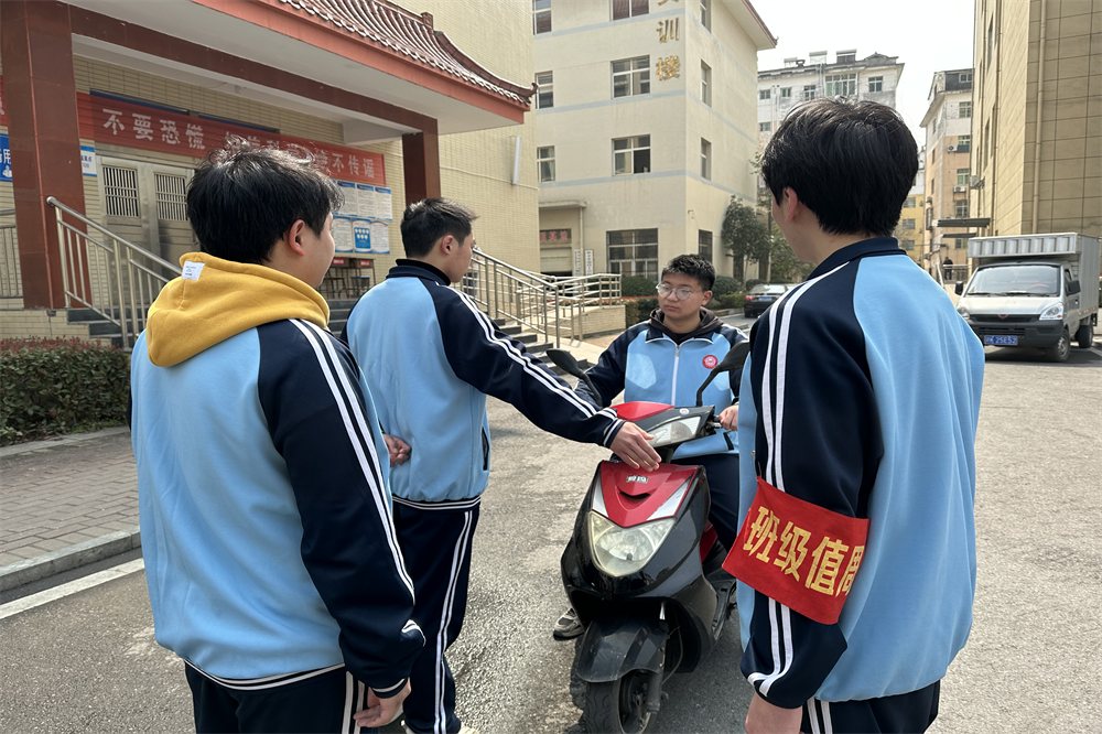 上下学期间,由值周班组成的志愿者在校园各处设点,进行交通文明劝导,对未佩戴安全头盔的师生进行宣传教育,让师生树立自觉佩戴安全头盔的意识。