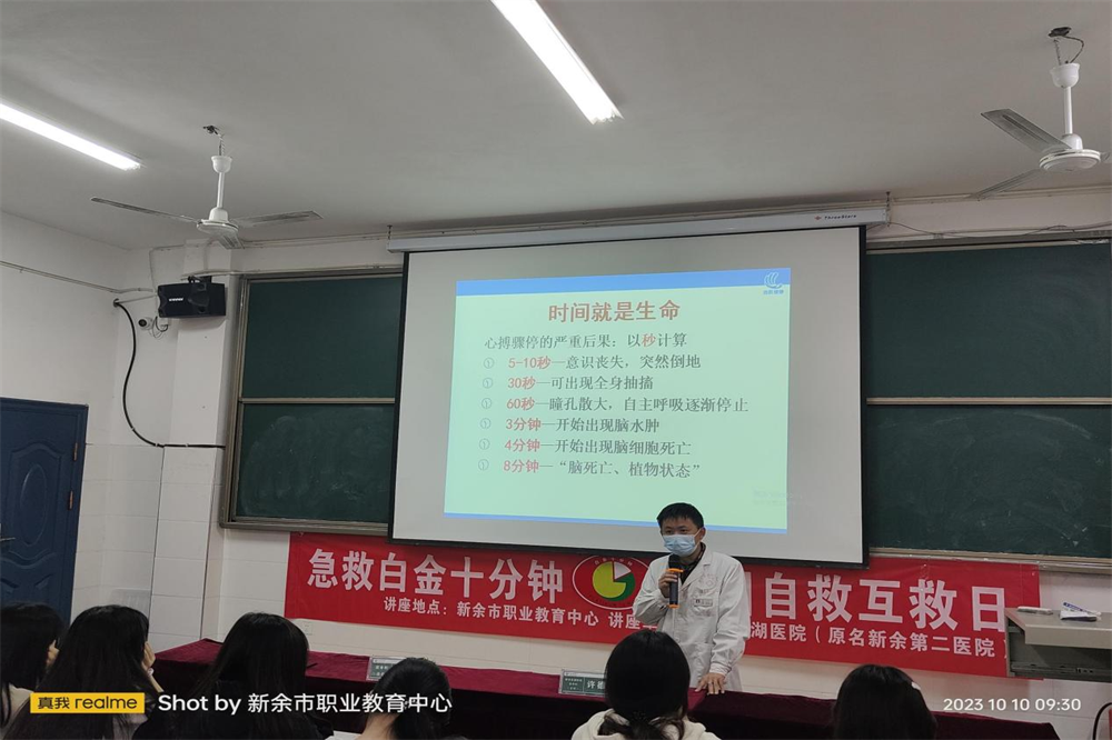 为普及应急救护基本技能,提高应急救护能力,10月10日上午,新余北湖医院“白金十分钟─全国自救互救”志愿服务团队到我校开展医疗急救知识培训,数字经济产业系100余名学生参加了“急救白金十分钟─国际自救互救日”活动。活动由系部主任林露主持。