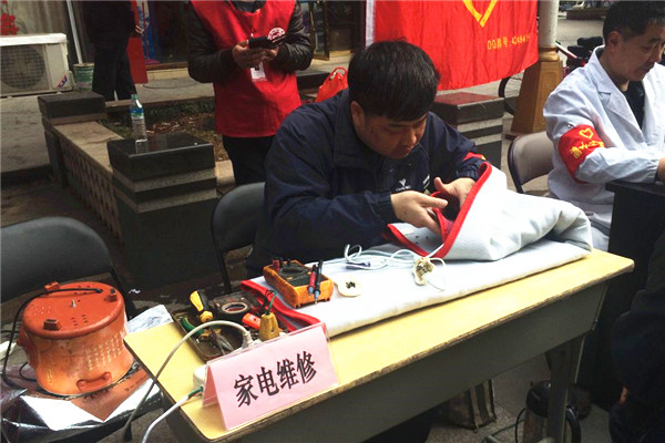 活动现场,我校电工电子专业傅拾生老师担任义务修理家用电器项目,居民们纷纷把需要维修的家用电器拿给傅老师修理。一位居民拿着一个陈旧的电热毯来到工作台前,她说这个电热毯用了很久,有感情了,前段时间坏了,正在犯愁到哪里去修,看到摆台就赶紧送来了。傅老师用专业仪器仔细检查后发现是线路连接问题,他检查出问题后很快修好电热毯。看着修好的电热毯居民脸上露出了开心的笑容。团员志愿者在整个活动现场维持秩序,与正在等位的老年人按摩聊天,向来往居民们介绍本次活动的服务项目,引导需要帮助的居民来到各个工作台前接受义务服务。