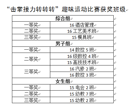 经过激烈的角逐,最终16酒店管理班、14数控5班、15电会2班分别获得了综合组、男子组和女子组的一等奖。