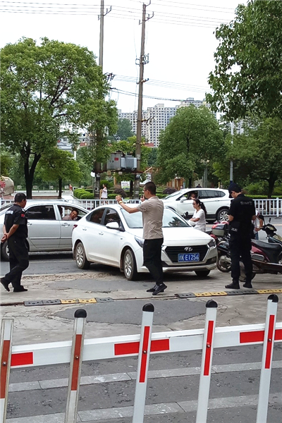 近日,为维持校园期末交通秩序,保障广大师生安全,在学校本学期期末考试最后一场结束的时间,保卫处早做准备,联系市特警大队和派出所民警到校协助校门交通秩序。早早就有大批住校学生家长开车来校接孩子、拿行李回家,虽然烈日当空,气温较高,市职教中心保卫处人员及学校保安冒着高温在学校校门维持、指挥交通秩序,确保了校门交通秩序和师生出行安全。